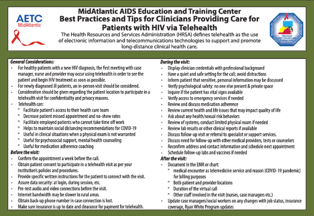 Best Practices and Tips for Providing Telehealth Care The Health Resources and Services Administration (HRSA) defines telehealth as the use of electronic information and telecommunications technologies to support and promote long-distance clinical health care. This guide reviews best practices and tips for clinicians providing care for patients with HIV via telehealth. It includes a sample script for starting and ending telemedicine and other considerations for before, during, and after the visit. |