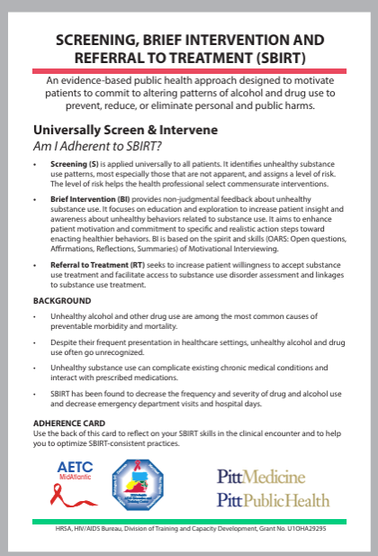 SBIRT - Screening, Brief Intervention and Referral to Treatment An evidence-based public health approach designed to motivate patients to commit to altering patterns of alcohol and drug use to prevent, reduce, or eliminate personal and public harms. |