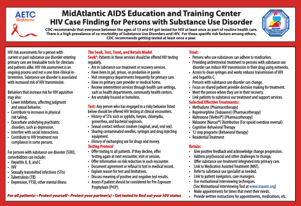 HIV Case Finding for Persons with Substance Use Disorder This resource provides information related to HIV testing and risk assessment for patients who have a history of substance use. Substance misuse and substance use disorders are associated with an increased risk of HIV transmission. While everyone should be tested at least once in their lifetime, patients with a history of substance use should undergo HIV testing regularly and consider biomedical prevention like PrEP or PEP. This pocket guide details these clinical considerations, as well as provides a clear drug and alcohol risk assessment script to aid the clinician in discussing risks and harm reduction with their patients. |