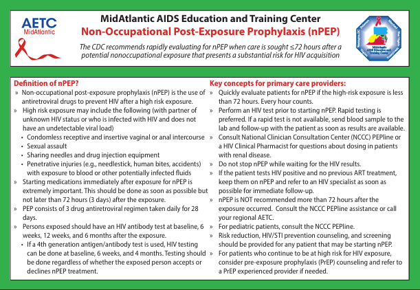 Non-Occupational Post-Exposure Prophylaxis (nPEP) This resource provides information related to the definition of nPEP, key concepts for primary care providers, and a summary nPEP procedure. |