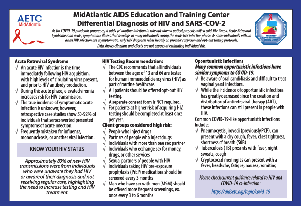 Differential Diagnosis of HIV and SARS-COV-2 As the COVID-19 pandemic progresses, it adds yet another infection to rule out when a patient presents with a cold-like illness. Acute Retroviral Syndrome is an acute, symptomatic illness that develops in many individuals during the acute HIV infection phase. As some individuals with an acute HIV infection are asymptomatic, early HIV diagnosis relies heavily on provider suspicion and opt-out testing protocols. This resource reviews HIV testing recommendations, common COVID-19 like opportunistic infections, and provides a chart showing clinical presentation comparisons of HIV and COVID-19. |