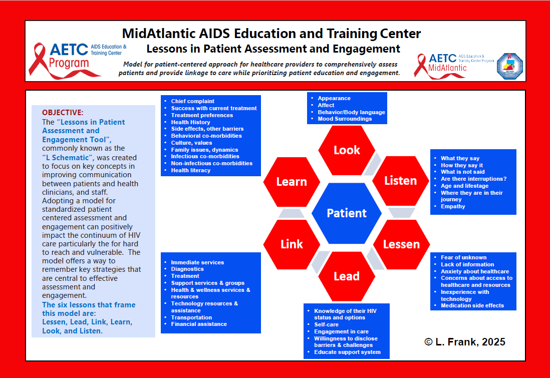 Lessons in Patient Assessment and Engagement This resource provides information on key concepts for improving communication between patients, health clinicians, and staff. Adopting a model for standardized patient-centered assessment and engagement can positively impact the continuum of HIV care, particularly for hard-to-reach and vulnerable populations. This model offers a way to remember key strategies that are central to effective assessment and engagement. |