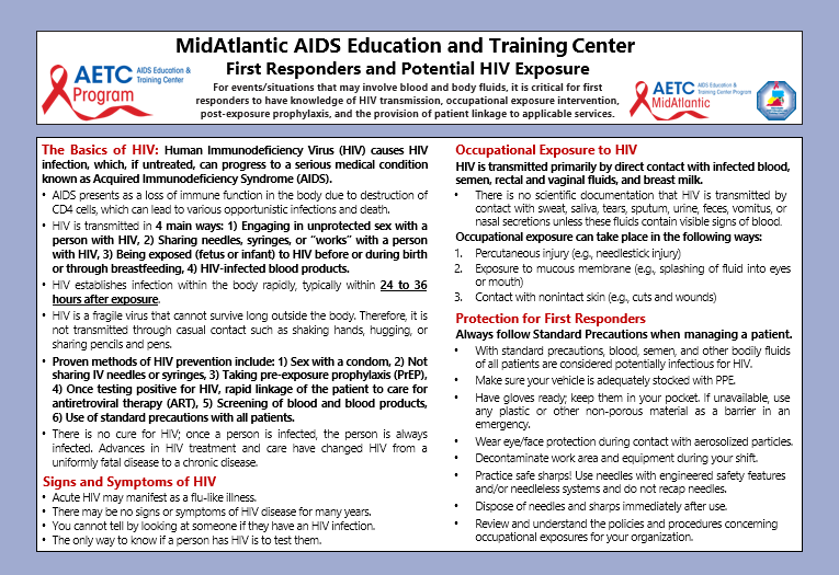 First Responders and Potential HIV Exposure For events/situations that may involve blood and body fluids, it is critical for first responders to have knowledge of HIV transmission, occupational exposure intervention, post exposure prophylaxis, and the provision of patient linkage to applicable services. |