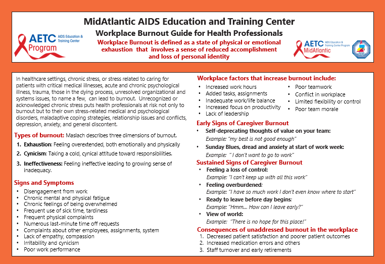 Workplace Burnout Guide for Health Professionals Burnout is defined as a state of physical or emotional exhaustion that involves a sense of reduced accomplishment and loss of personal identity. This guide discusses the types of burnout, the early signs of burnout in caregivers, consequences of not addressing burnout and more. It also offers ideas, methods, and interventions for burnout and related psychological disorders. |