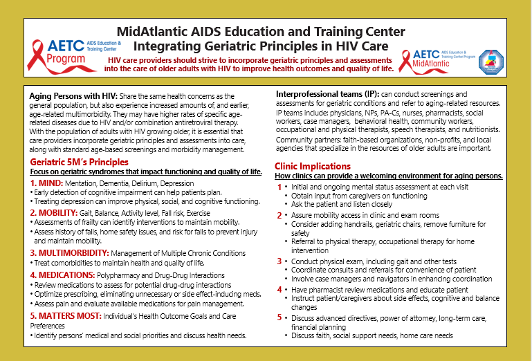 Integrating Geriatric Principles in HIV Clinic HIV care providers should strive to incorporate geriatric principles and assessments into the care of older adults with HIV, thus improving health outcomes and quality of life. This pocket guide reviews the geriatric 5M principles, the clinical implications, and the importance of incorporating geriatric assessments. |