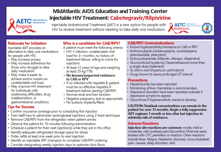 Injectable HIV Treatment: Cabotegravir/Rilpivirine; This resource provides information on how Injectable Antiretroviral Treatment (ART) is a new option for people with HIV to receive treatment without needing to take daily oral medication. |