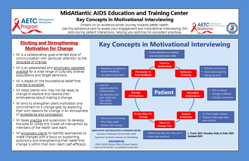 Key Concepts in Motivational Interviewing Use this adherence card to assess your engagement and motivational interviewing (MI) skills during interactions, aiding you in optimizing MI-consistent practices to promote HIV outcomes. |