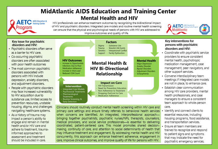 HIV professionals can enhance treatment outcomes by recognizing the bidirectional impact of HIV and psychiatric disorders. Integrated care models and routine mental health screening can ensure that the physical and psychological needs of persons with HIV are addressed to improve outcomes and quality of life. |