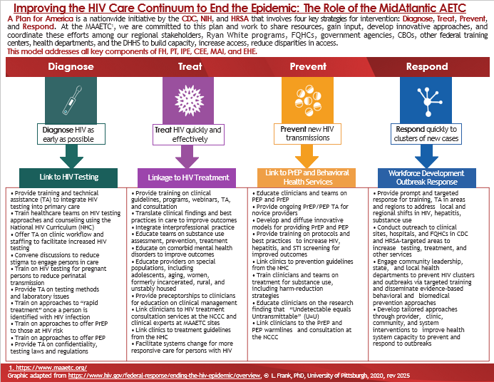 EHE Key Strategies Infographic Ending the HIV Epidemic is a national initiative focusing efforts in 48 counties, Washington, D.C., San Juan, PR, and 7 states that have a substantial rural HIV burden, accounting for over half of the new HIV diagnoses in the U.S. This infographic demonstrates the role of the MAAETC in the Ending the HIV Epidemic Initiative. |
